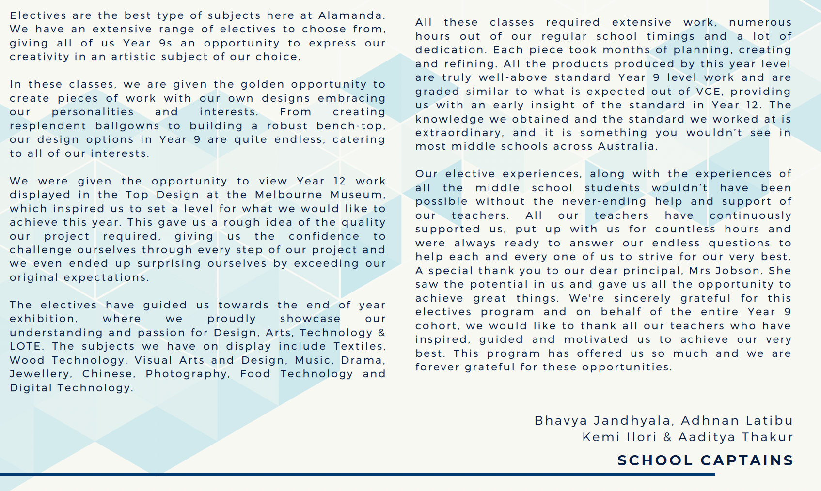 At Alamanda College, our Electives Program is designed to capture the unique interests of our students, keeping them engaged and excited about learning. By offering a broad spectrum of subjects, we provide multiple opportunities for students to ignite their curiosity and support them to become well-rounded individuals. Whether they are aspiring athletes, academics, artists, designers, or tech enthusiasts, our diverse and engaging electives inspire students to explore their passions and pursue their future aspirations.